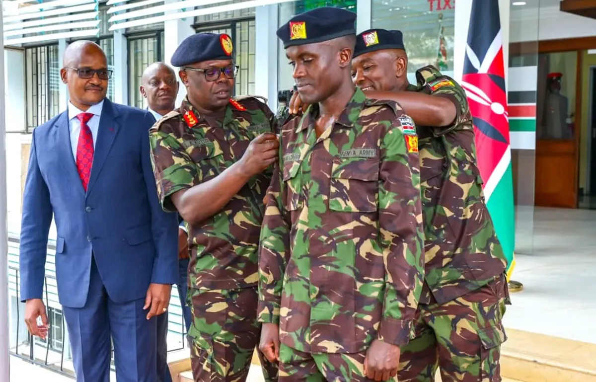 The promotion ceremony took place at the Defence Headquarters in Nairobi on Wednesday, officiated by Major General Luka Kutto, General Officer Commanding Eastern Command, and presided over by Chief of Defence Forces General Charles Kahariri.