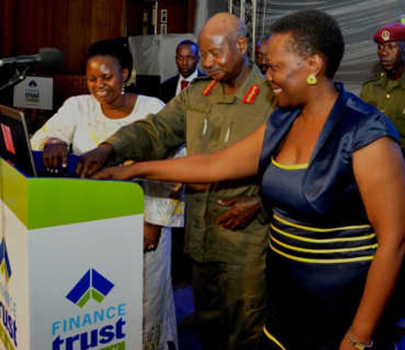 President Museveni launching Finance Trust bank. Right is Ms. Irene Muloni