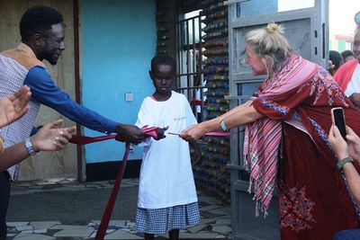 Patrick Muvunga and Diana Kruger help a young girl to cut the tape during the opening of the Promise Hub in Nakivale
