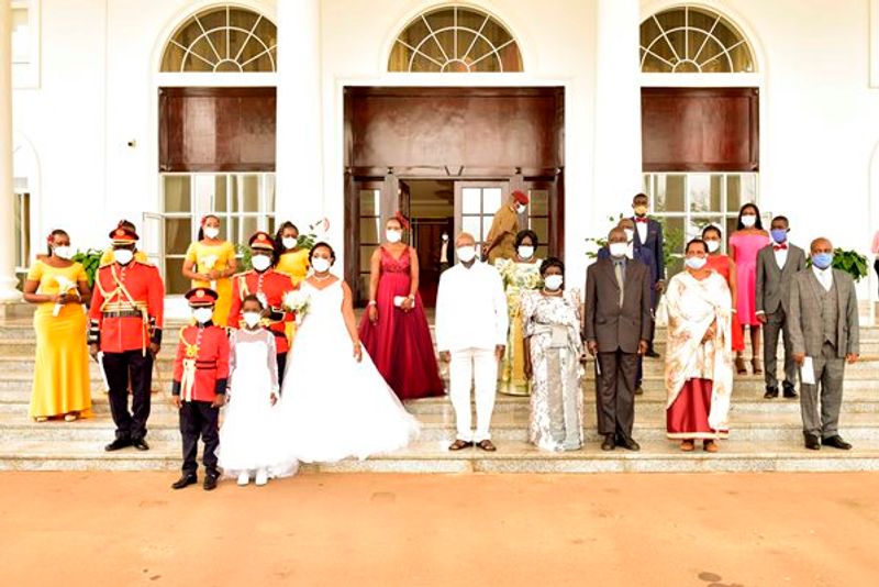 President Museveni Yoweri in a group photo with the newly wedded couples Brig Gen. Peter Candia and Doreen Busigye, the President hosted them for a luncheon at the State House Entebbe on October 3, 2020. Photo PPU / Tony Rujuta.