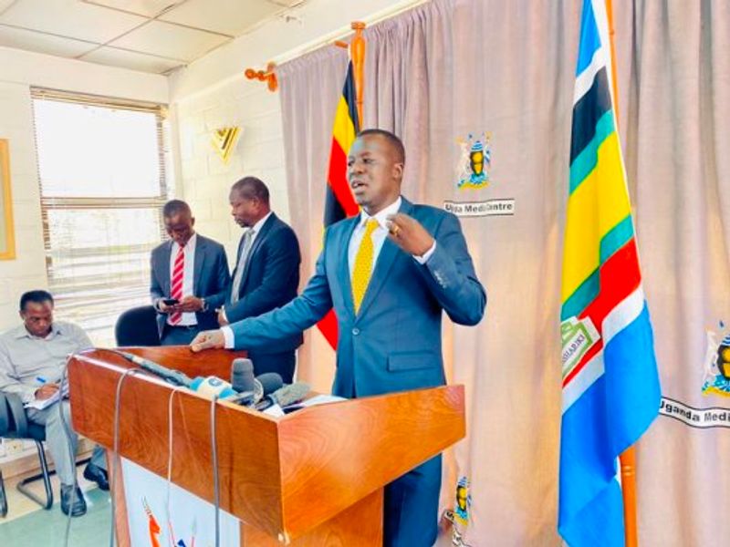 Chairperson Board of Trustees UNCC Sam Kelo Okello adressing the press at Media Center.