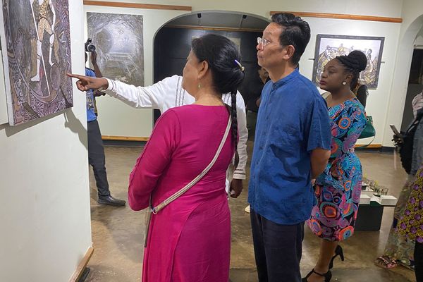 Chinese Ambassador Zhang Lizhang and his wife share a moment with Artist Master Ntakky (right) during his solo exhibition at Nommo Gallery, Kampala — August 1, 2025.