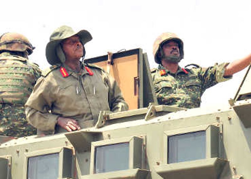 Museveni inspecting his troops from an armoured carrier with guidance from Brig. Muhanga