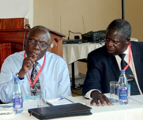 LEFT: Ndejje’s Vice Chancellor Prof. Lugujjo with Prof. Asubo discuss EAC regulations on Education