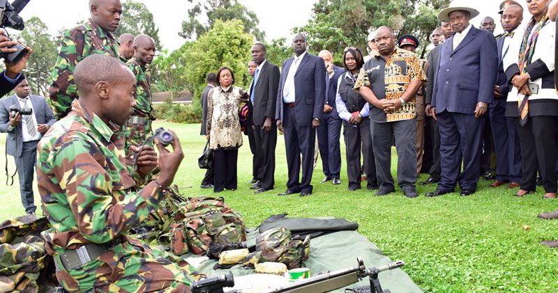 President’s Museveni and Bongo of Gabon (2nd L) of Gabon watch demonstrations by Kenyan wildlife rangers on how to respond to emergencies at the Giant Club Summit at Fairmont Hotel in Laikipia Kenya recently