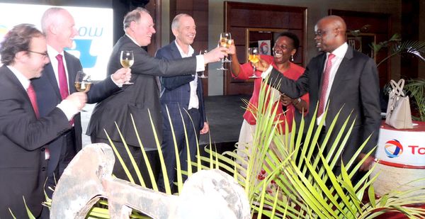 Energy minister Irene Muloni toasts to the launch of the FEED study this week with the executives from the Oil Sector. Right is Total’s GM Adewale Fayemi
