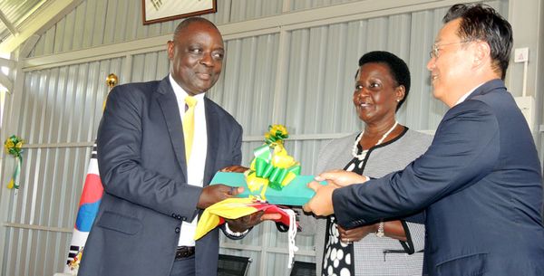 South Korean Envoy Park Jongdae hands over keys to the leadership centre to Agriculture Minister Vicent Ssempijja while area MP and Trade Minister Amelia Kyambadde looks on