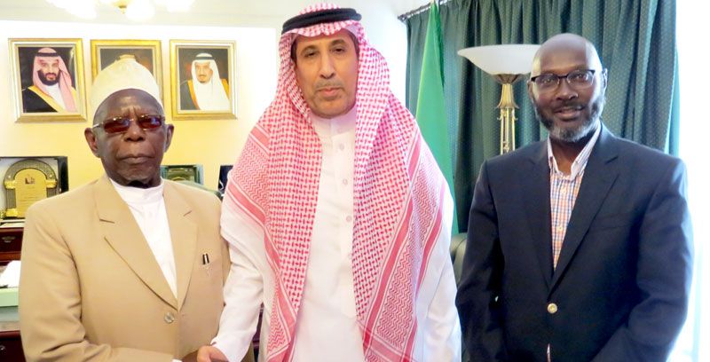 The Director of Muslim World League Sheik Obeid Kamulegeya (Left) paying a courtesy call to his Excellency the Ambassador of Saudi Arabia to Uganda Dr. Abdallah Bin Fahad Al Kahtani. To witness the meeting was the Director of the World Muslim Youth Assembly Dr. Swaibu Ssemuwemba, (right) Photo by Kassim Lubega