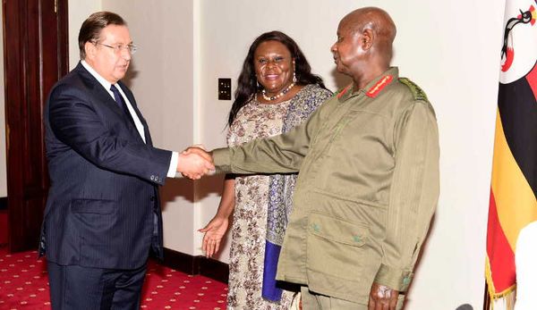 President Museveni shakes hands with UN investigator Dmitry Titov at State House in Entebbe. UN Resident Coordinator Ms. Rose Malango attended the meeting