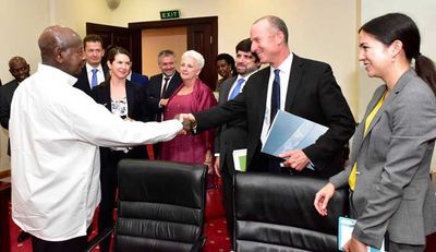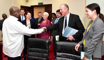 President Yoweri Museveni shakes hands with US Trade Agency officials at State House in Entebbe