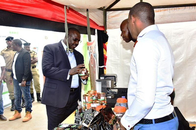 Clerk to Parliament Jane Kibirige 2nd right visiting a stall by MUK department of food science during the Parliament Week last month