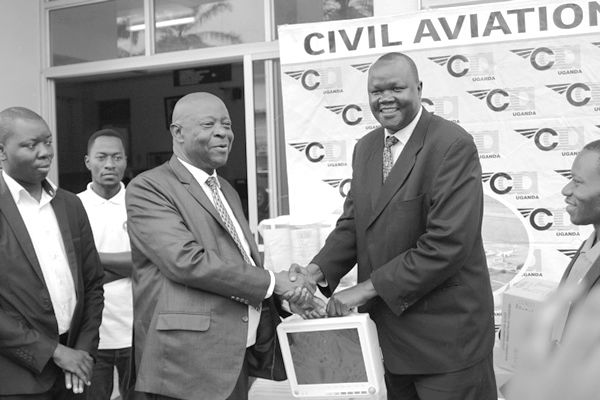 Uganda Civil Avition Director General Prof. David Kakuba hands over medical equipment to Dr. Martin Opumar