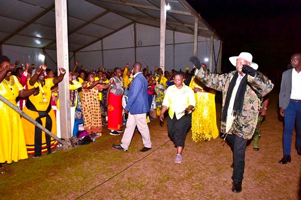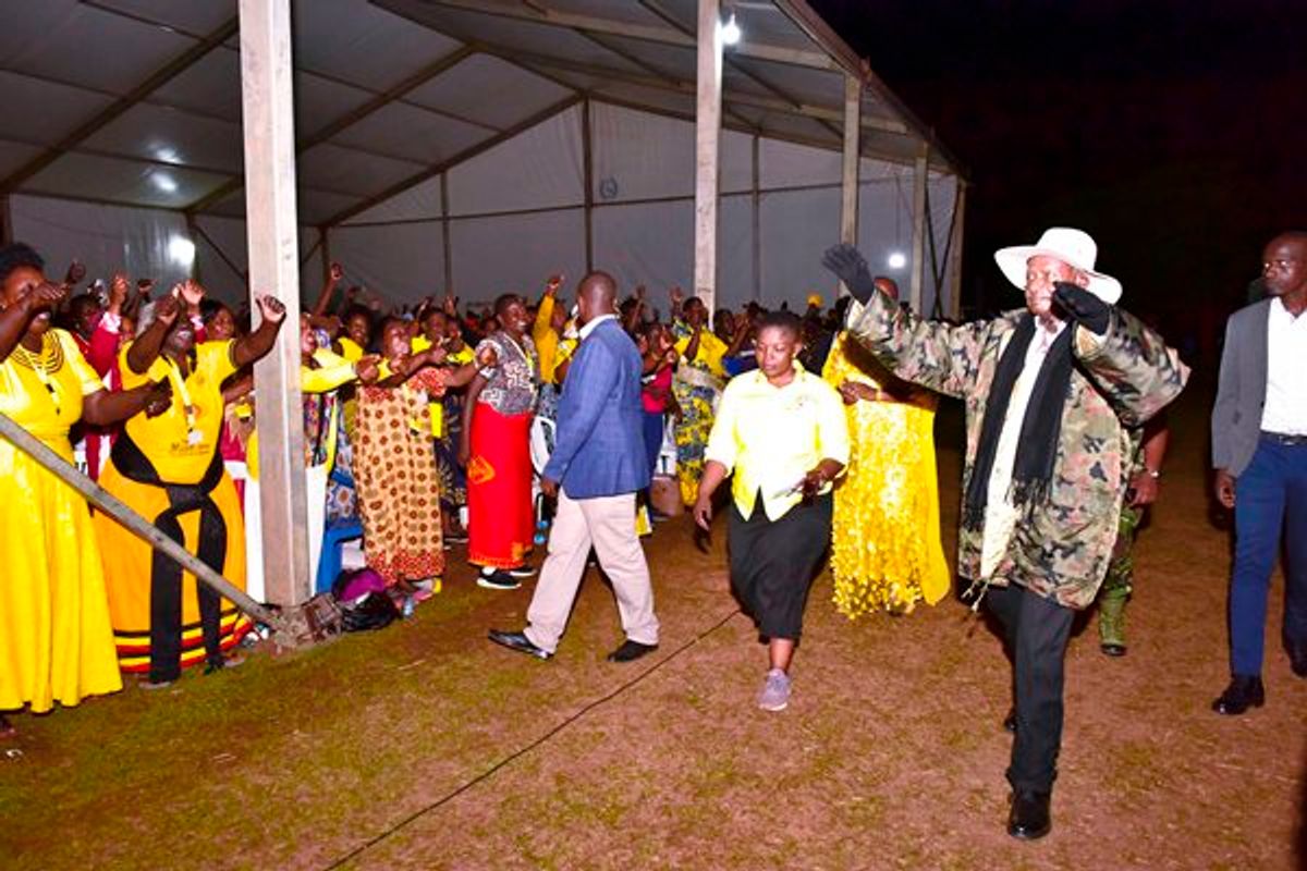 President Yoweri Museveni waving at the crowds as he arrives at Nyondo Core PTC campus to conclude the NRM National Women League Leadership course in Mbale PPU Photo