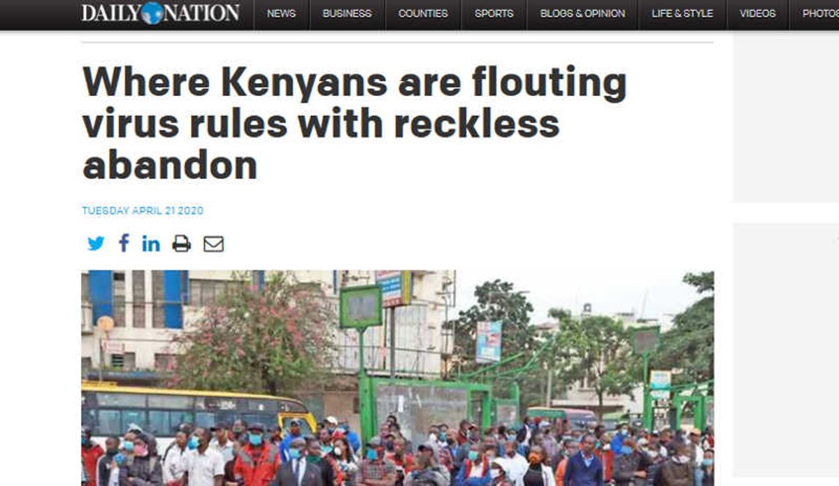 A screen grab of Daily Nation’s report on the government’s lax implementation of social distancing measures recommended by WHO to COVID-19