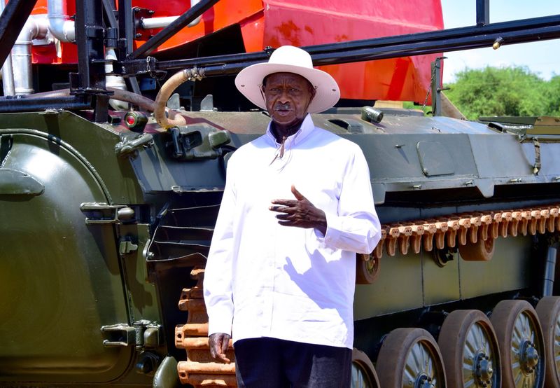 President Yoweri Museveni has unveiled Uganda’s first prototype army truck designed for all terrain firefighting situations that can also be used for pest control with minimum human interface.