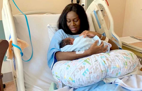 Kanyomozi shared the beautiful post-labour pictures of her cuddling baby Taj on a hospital bed.
