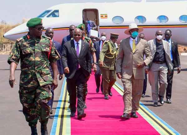 Museveni during his last visit to Tanzania at the invitation of the late President John Pombe Magufuli. While Museveni kept his mask on, his Tanzanian counterpart remained free