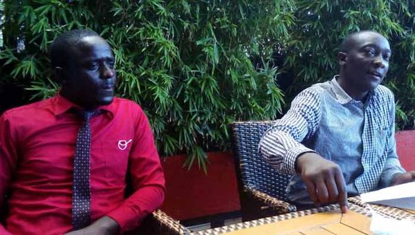 Eric Okek, the President of the medical laboratory society, left, while addressing a news conference