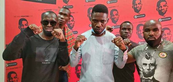 L-R: Singer Nubian Li, NUP President Robert Kyagulanyi and Eddie Mutwe clench fists as a symbol of their readiness to continue to fight for power