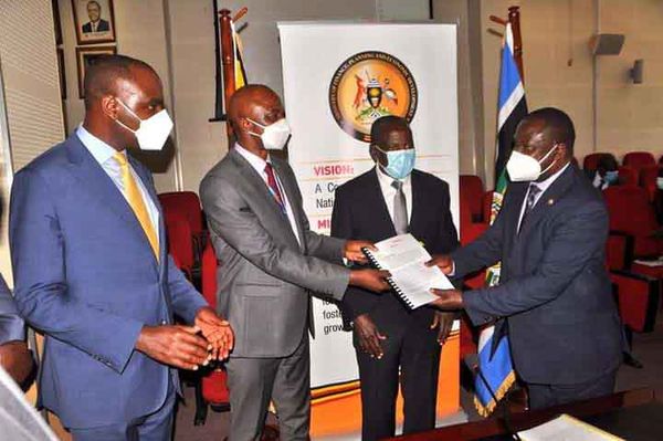PS/ST Ramathan Ggoobi, second left, receiving the office from acting DST Patrick Ocailap. Minister Kasaija, third left, and assistant Minister Musaasizi witnessed the peaceful handover of the office