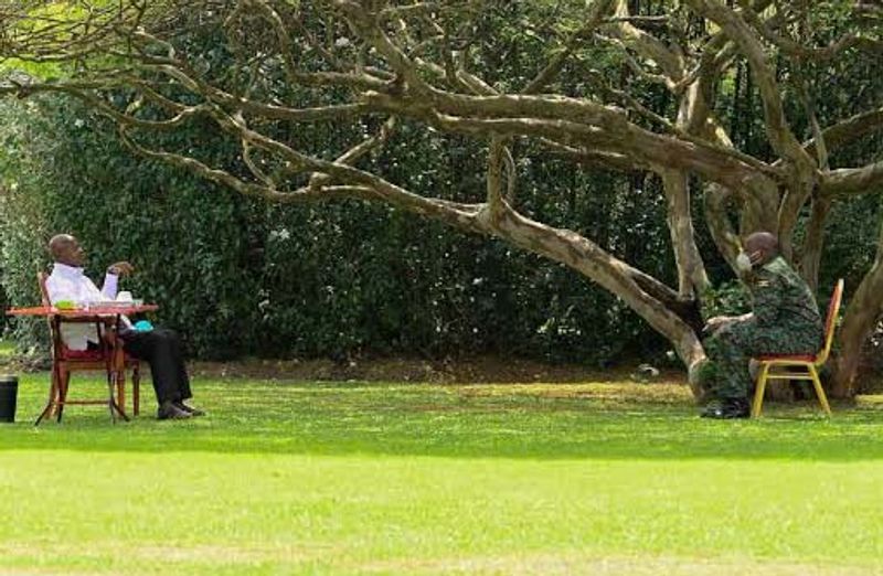 President Yoweri Museveni (left) chats with son Gen. Muhoozi Kainerugaba