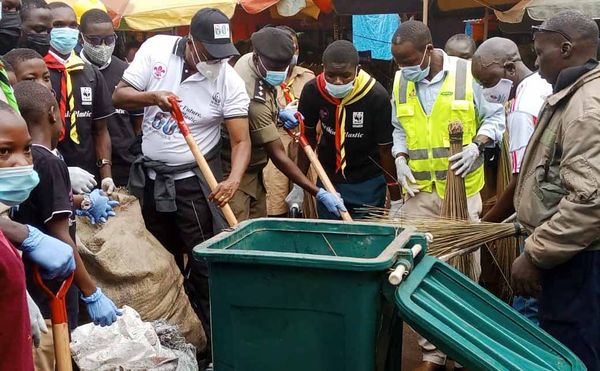 WWF boss David Duli with colleagues cleaning Bugoloobi market