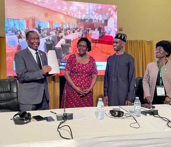 NBI Executive Director Eng. Sylvester Matemu displaying the signed Kampala declaration, that agreed by participants before the Minister of State for Environment Beatrice Anywar, (2nd left) who officiated the closing of the high-level event. Dr. Rashid Mbaziira, the Executive Secretary of African Ministers’ Council on Water (3rd left) witnessed the handover of the declaration.