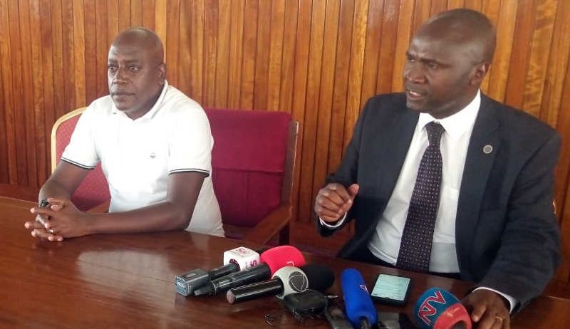 (L-R) MPs Joseph Ssewungu and Theodore Ssekikuubo addressing journalists yesterday at Parliament. Online Photo