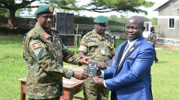 Retired-Corporal-Godfrey-Surundu (R) receiving-his-discharged-certificate-from-Brig-Gen-Felix-Busizoori (left)