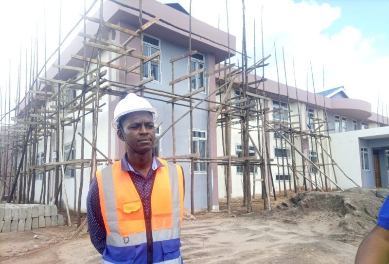 Mr. Silverter Kiluswa, the site engineer for Ngara district headquarters standing outside the block shortly before it was completed