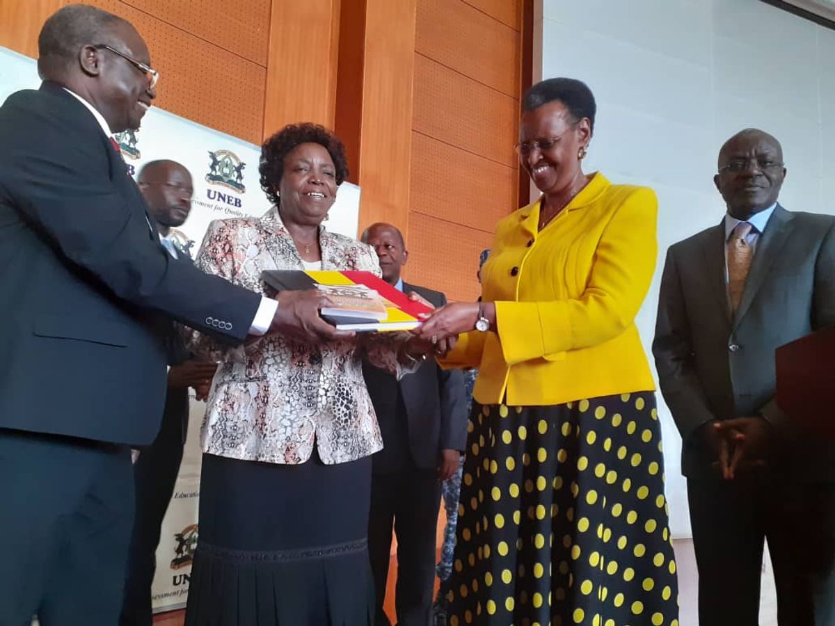 UNEB Chairperson Prof Mary Akwakol and UNEB Secretary Daniel Odongo hand over 2019 UACE results to the Minister of Education and Sports Janet Museveni