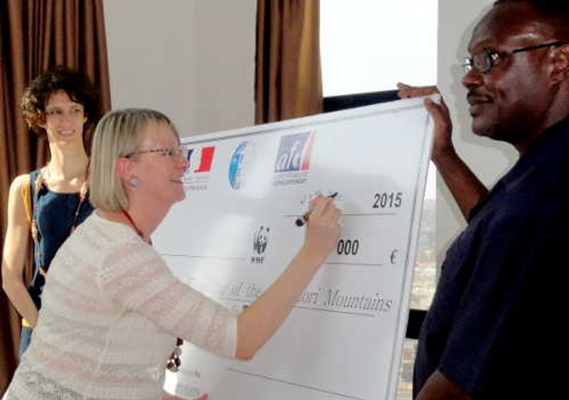 French Ambassador Sophie Makame signing the dummy cheque for WWF