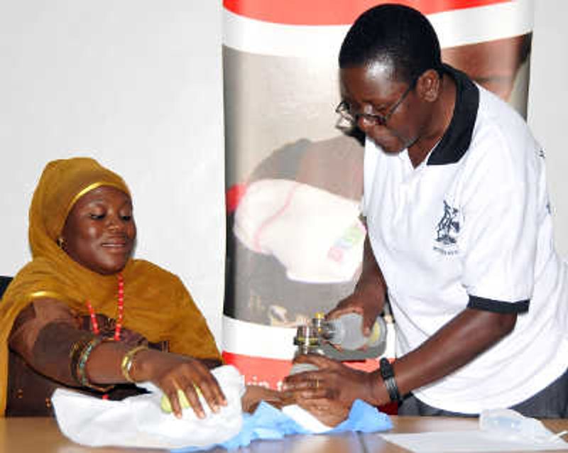 Save the Children’s Chief of Party Dr. Hanifer Ssengendo, Left, shows how a simple breathing tool can help a babe with breathing difficulties