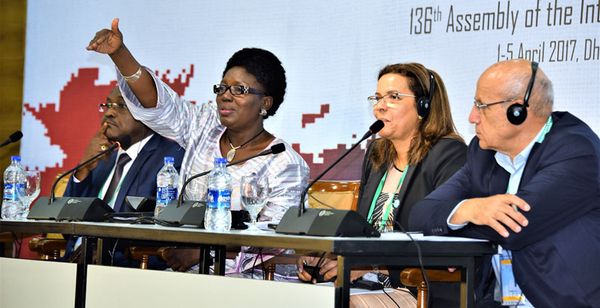Speaker of Parliament, Rt. Hon. Rebecca Kadaga while chairing a session of the 136th IPU in Dhaka, Bangladesh