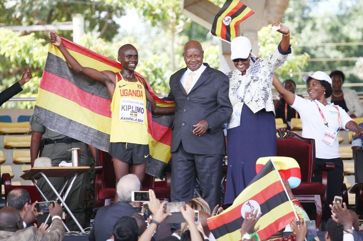 Jacob Kiplimo (R) joins President Museveni and First Lady after winning the gold medal at the 2017 IAAF World Cross Country Championships.