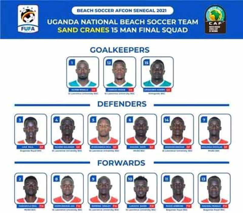 The head coach of the Uganda National Beach Soccer (Sand Cranes) Salim Jamal Muwonge has named the final team that will travel to Senegal for the 2021 Beach Soccer Africa Cup of Nations tournament.