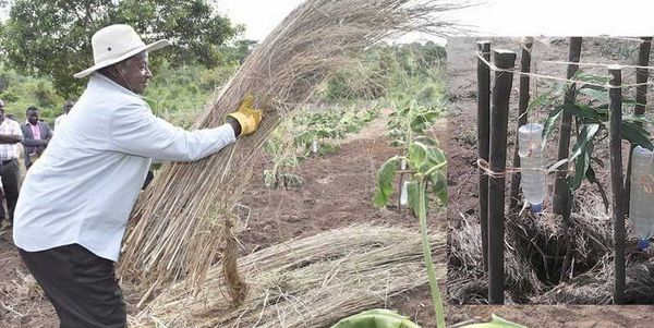 President Museveni has come under attack for promoting primitive technologies of using hand hoes and bottle irrigation’ (as shown inset photo) compared to modern ones like the use tractors and solar irrigation in his home region of Ankole
