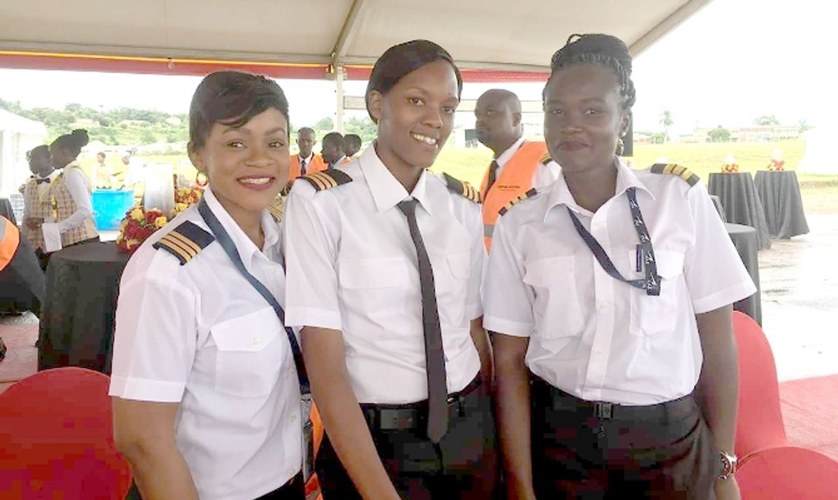 Uganda Airlines Line Pilots (L-R) Kayiwa Vanita, Nasirumbi Rita, Drazu Tina at the occasion to receive the first aircraft for Uganda Airlines