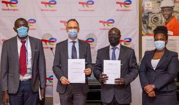 Total Energies CEO Poyane, right, shakes elbows with his CNOOC counterpart, and their Uganda National Oil Co. Boss Proscovia Nabbanja at the announcement of the FID