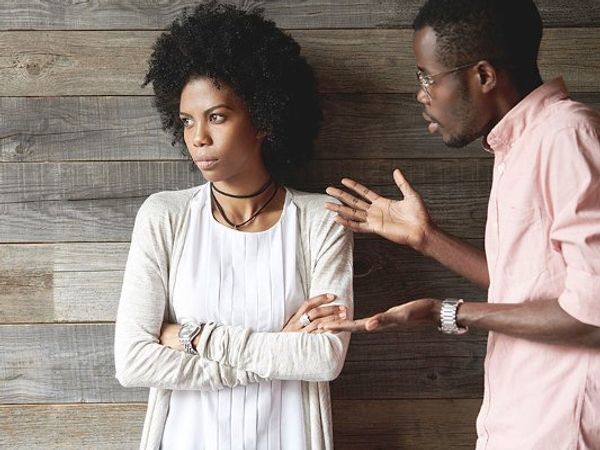 A man explaining to an angry woman