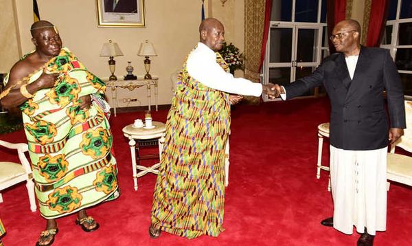 President Yoweri Museveni greets Kabaka Ronaldo Muwenda Mutebi. On his right is the Asantehe Osei Tutu II