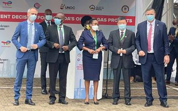 Total Energies CEO Patrick Pouyanné, right, shakes elbows with his CNOOC counterpart, and their Uganda National Oil Co. Boss Proscovia Nabbanja at the announcement of the FID