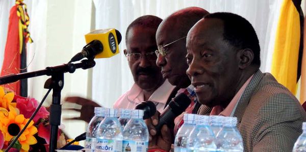 EC chairman Dr. Badru Kiggundu (right) with his deputy Joseph Biribonwa and Secretary Sam Rwakoojo at the National Tally Centre in Namboole stadium announcing the 2nd batch of results