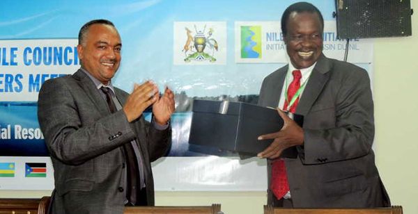 Kebede Gerba, Ethiopia’s Assistant Water and Electricity Minister handing a courtesy gift to his counterpart Sam Cheptoris at Entebbe, Uganda during the 25th Nile Council of Ministers meeting recently