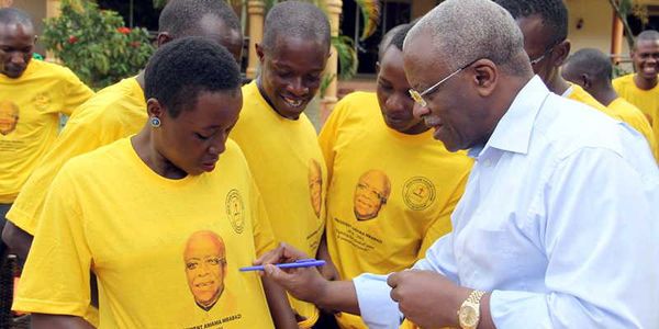 John Patrick Amama Mbabazi, who declared his intention to unseat president Museveni, web auto-graphing T-Shirts worn by his supporters while at his home in Kololo recently. Pix from Mbabazi’s Facebook page